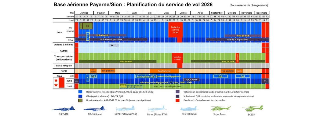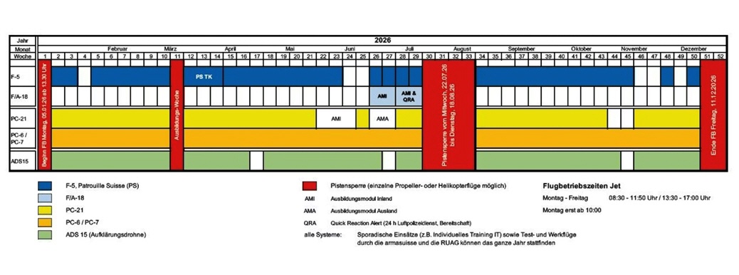 Geflogen wird in der Schweiz von Montag bis Freitag immer zwei Mal täglich. Die Morgenrunde findet zwischen 08.00 Uhr und 12.00 Uhr, die Mittagsrunde zwischen 13.15 Uhr und 17.00Uhr statt! Die Deutsche Luftwaffe verfährt hier nahezu gleich zu den Zeiten der Schweizer Luftwaffe!